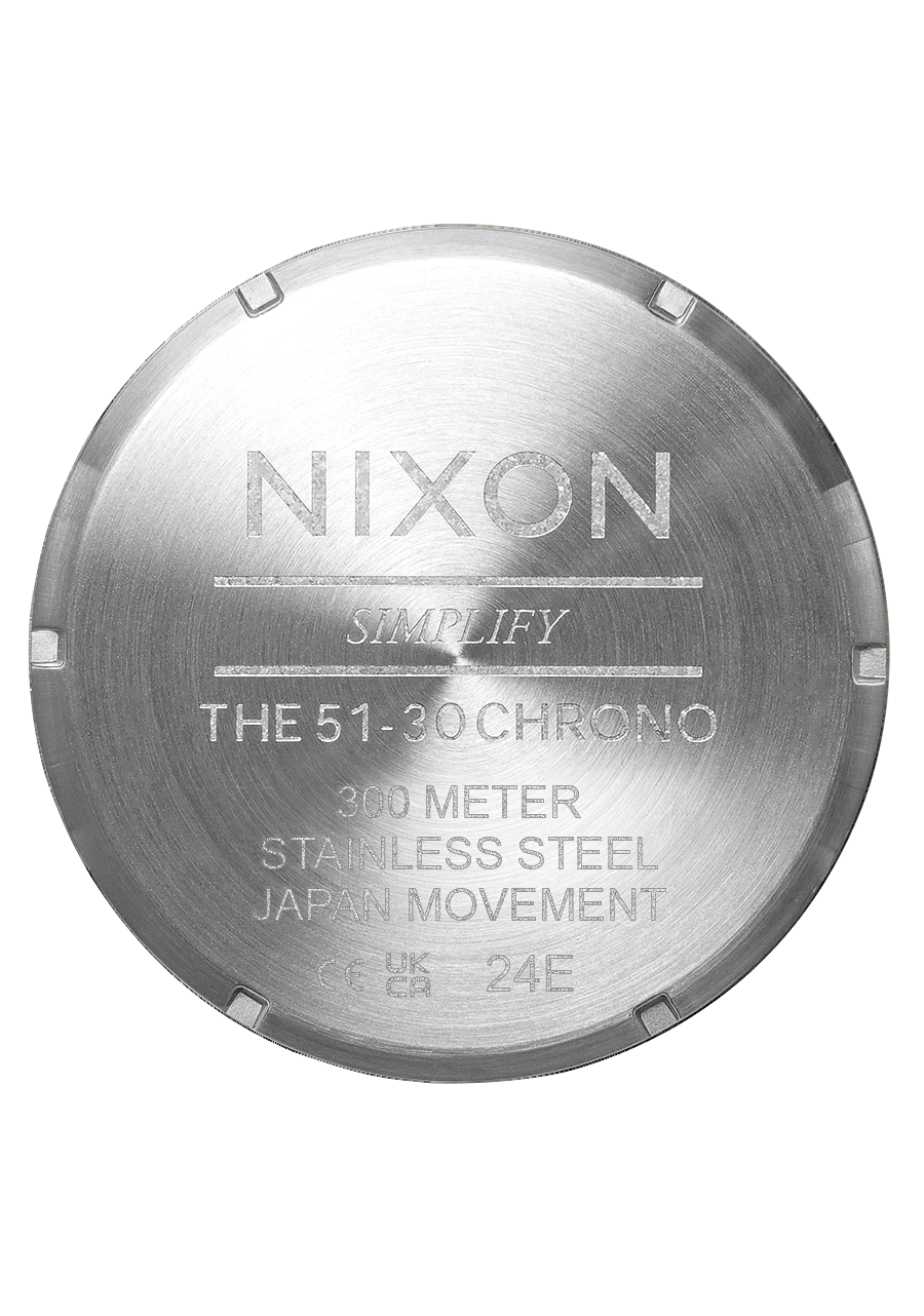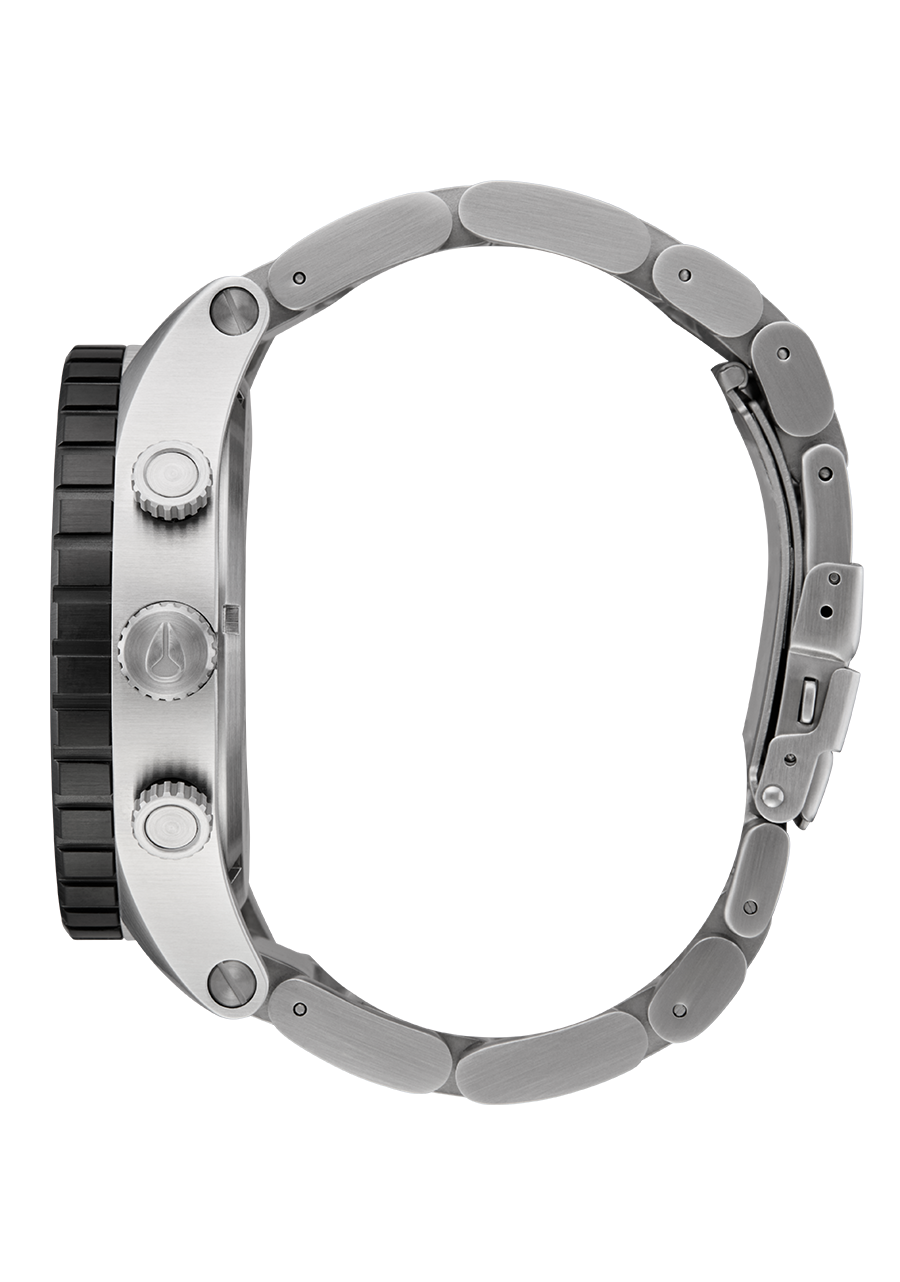 51mm custom solid stainless steel case with a 300 meter / 30 ATM water rating. Includes a unidirectional rotating bezel with countdown timer, hardened mineral crystal, screw down crown and pushers, stainless steel screw down caseback and screw pin lugs.