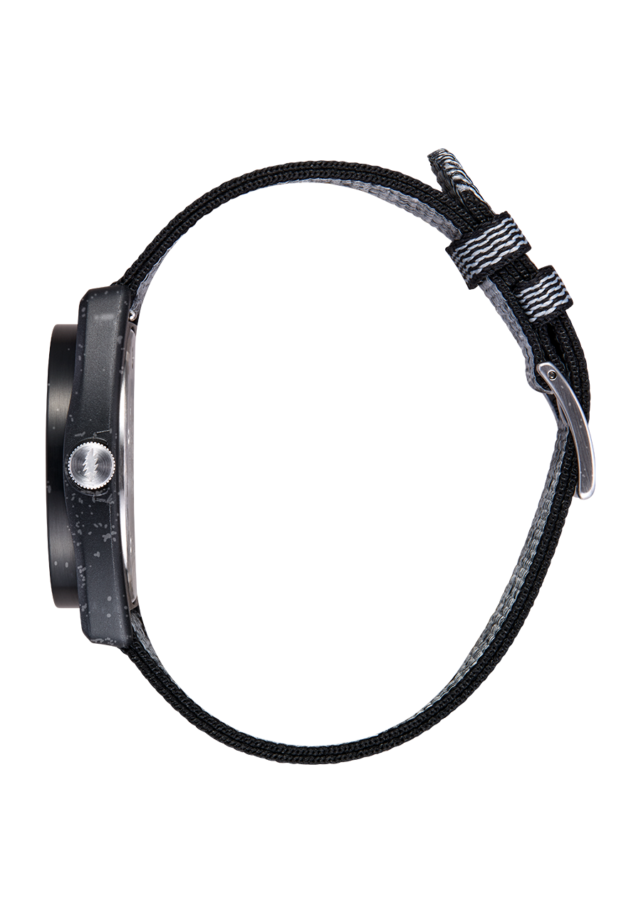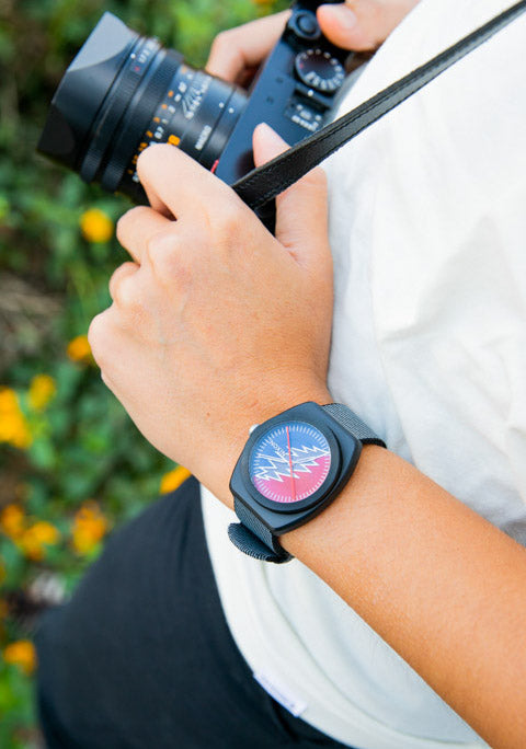 The Grateful Dead Light-Wave is the pinnacle of unnaturally natural alternatives. An ambitious, eco-friendly watch combines progressive design with solar charging and recycled ocean plastic construction, making it a clean, green red and blue, time-telling machine. Look past the iridescent 13-point lightning bolt at the split red and blue translucent face to catch a glimpse of the solar panel within. Back out a bit and notice the head-turning dial details and the unique case and strap design. Then realize you'll never change another battery and know you're on a higher frequency.